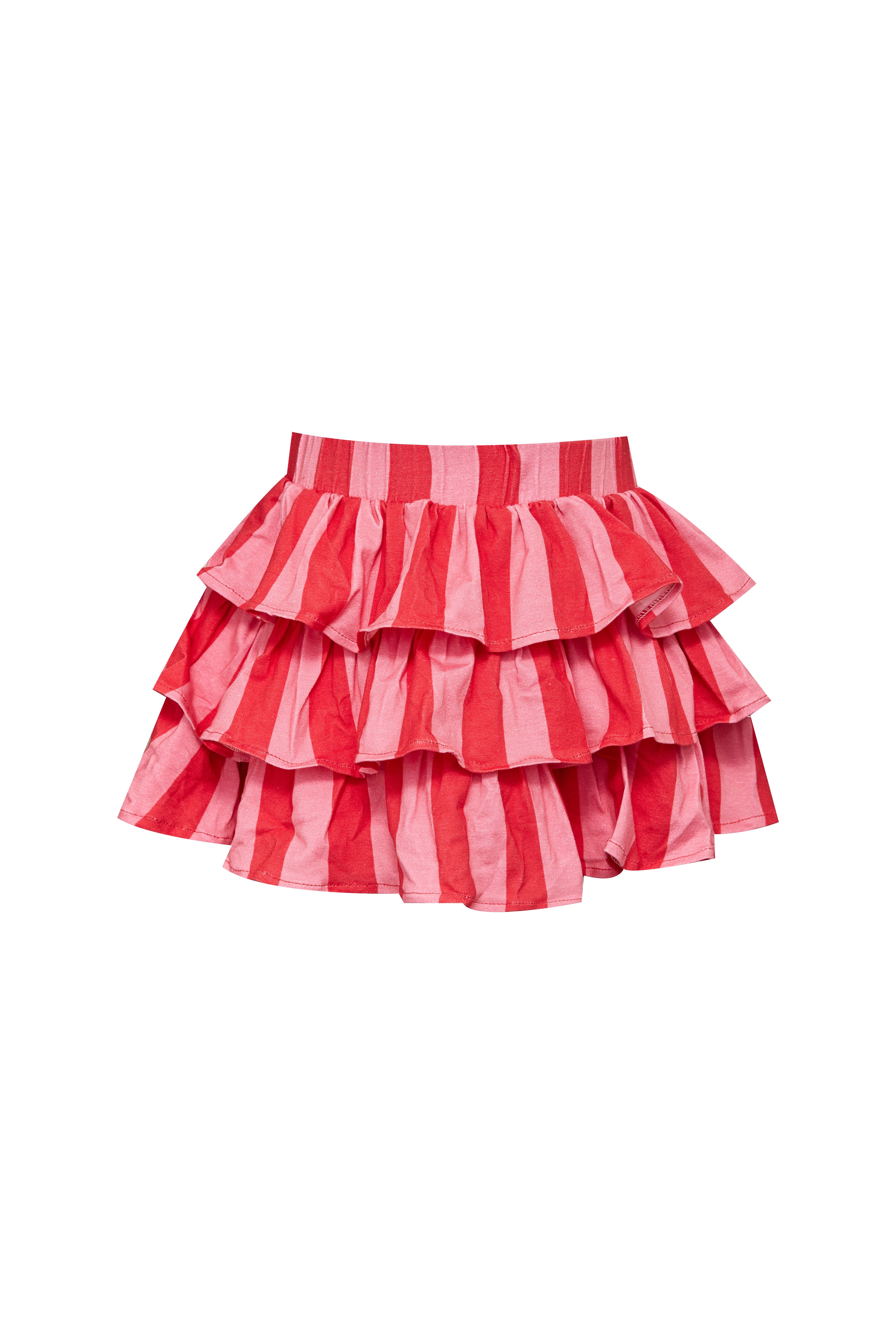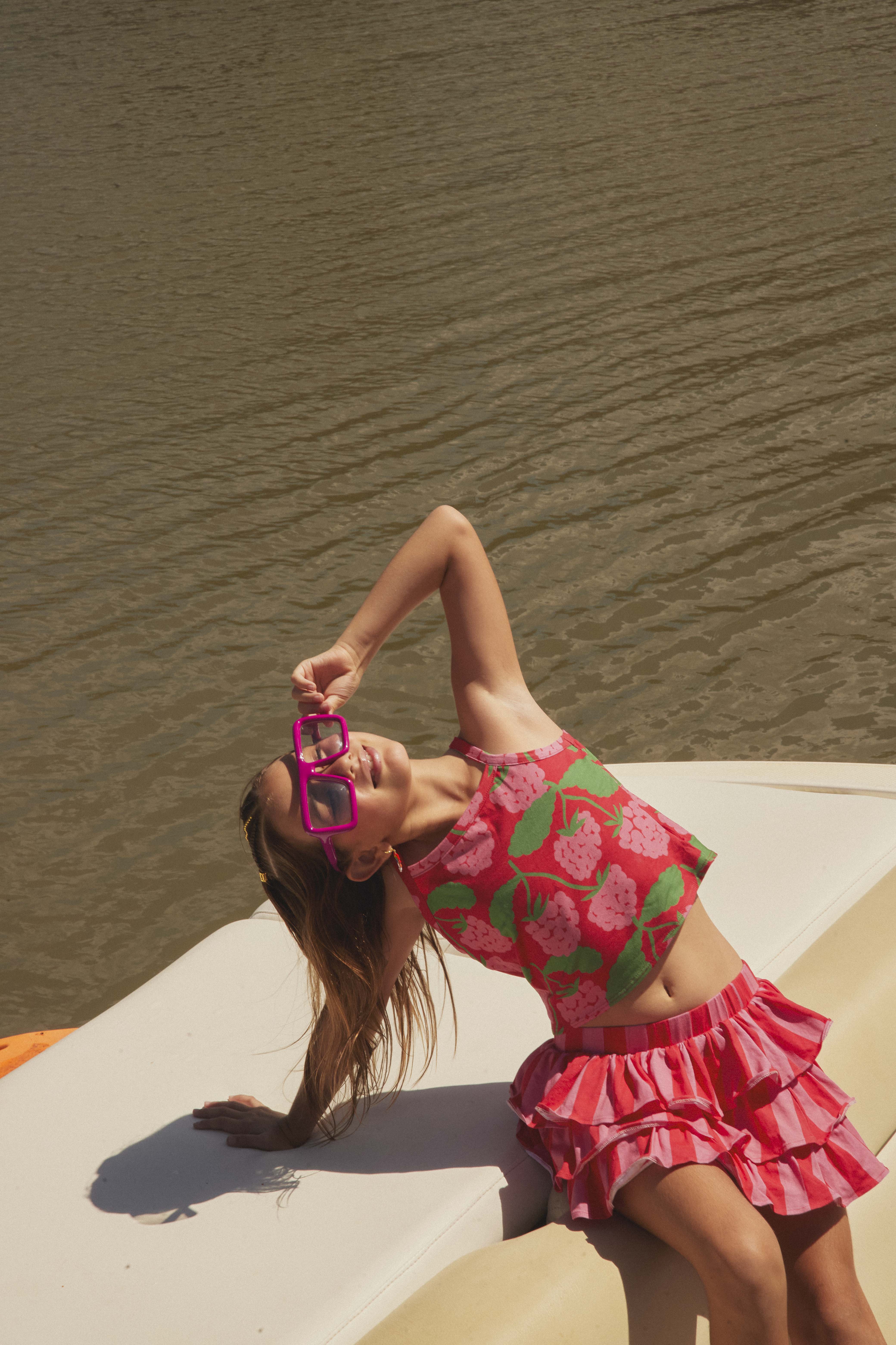 Set hecho en algodón con rayas que cuentan historias y frambuesas que parecen recién cosechadas. Este set combina una falda de golas llena de movimiento...
