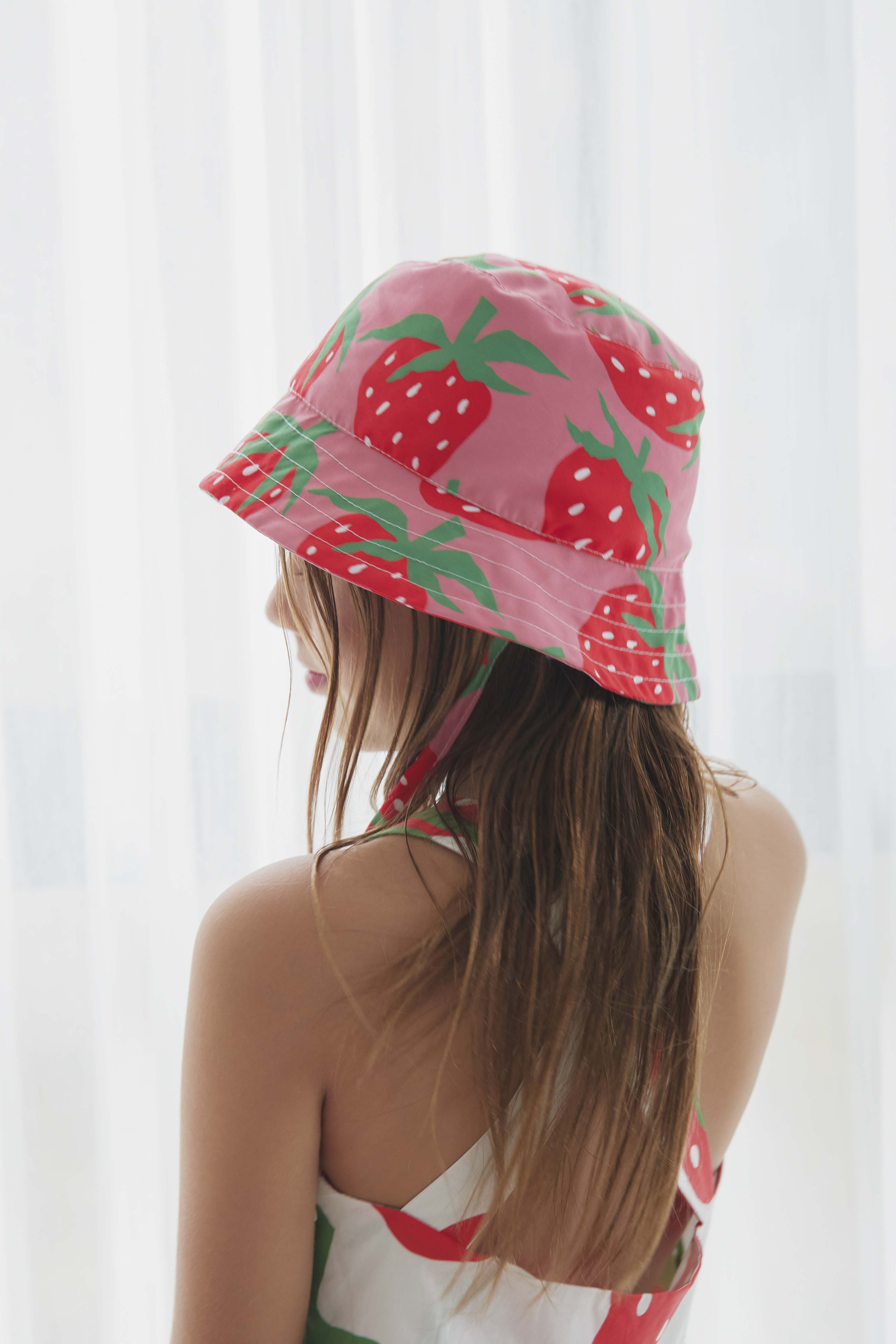Bucket hat merengue de fresa que combina diversión y protección. Hecho con botellas plásticas recicladas, es amigable con el planeta mientras cuida la piel de...