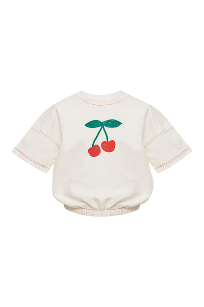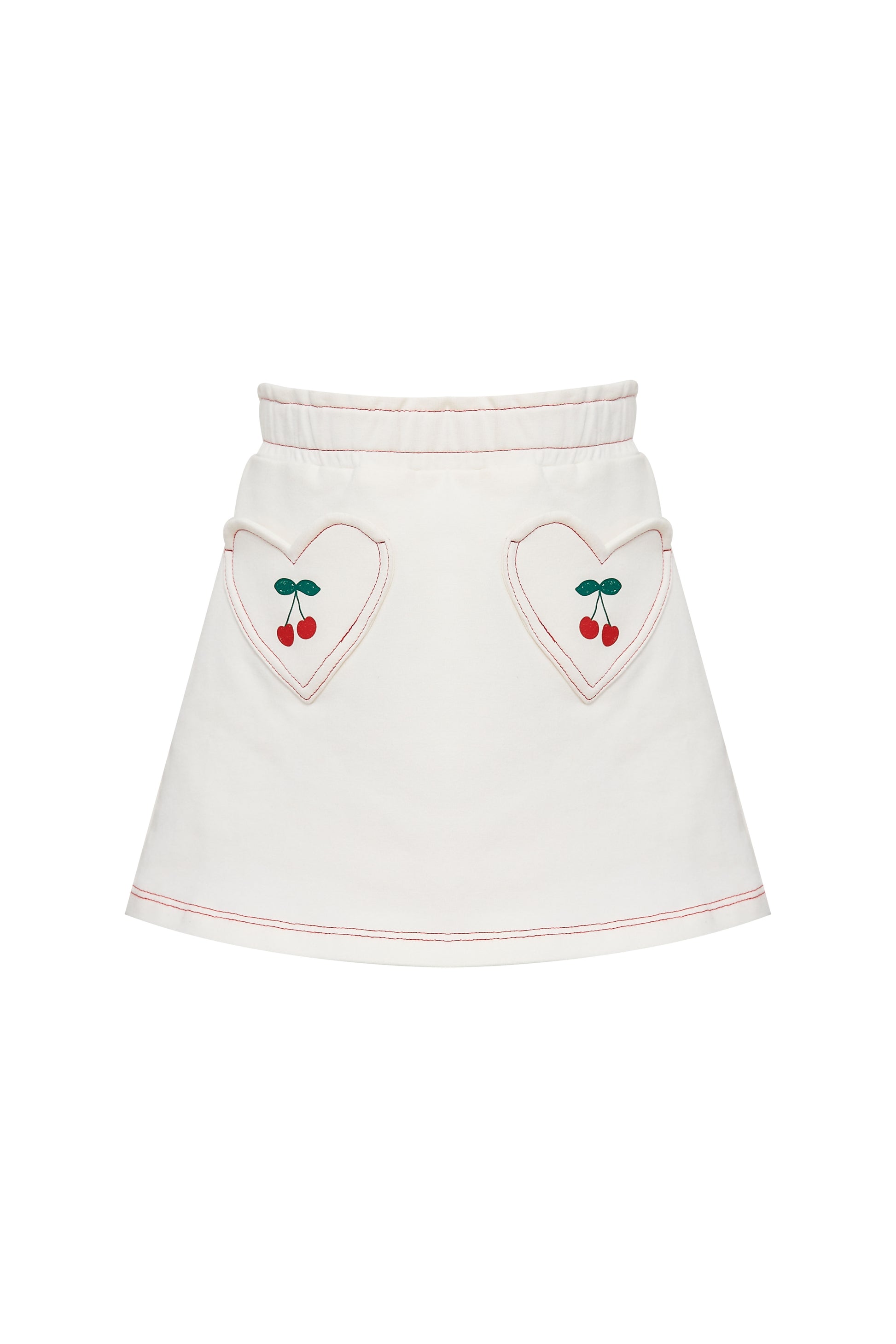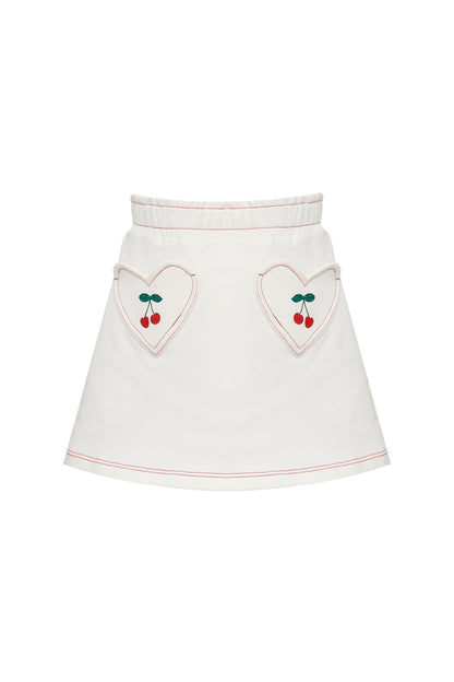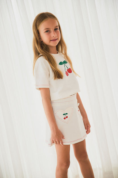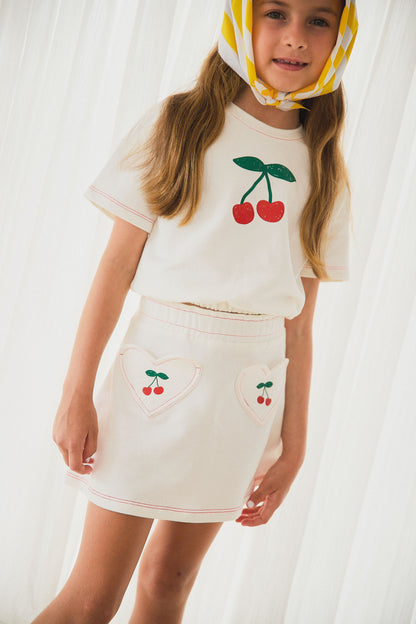 Este conjunto es una explosión de alegría: la camisa manga corta blanca, con una cereza estampada bien jugosa en el centro, grita frescura total. Y la falda, ¡Ay, la falda! Con bolsillos en forma de corazón llenos de cerezas, es perfecta para guardar tesoros o simplemente un look que vibra con energía. Todo en algodón tan suave y delicioso que parece hecho para un smoothie.